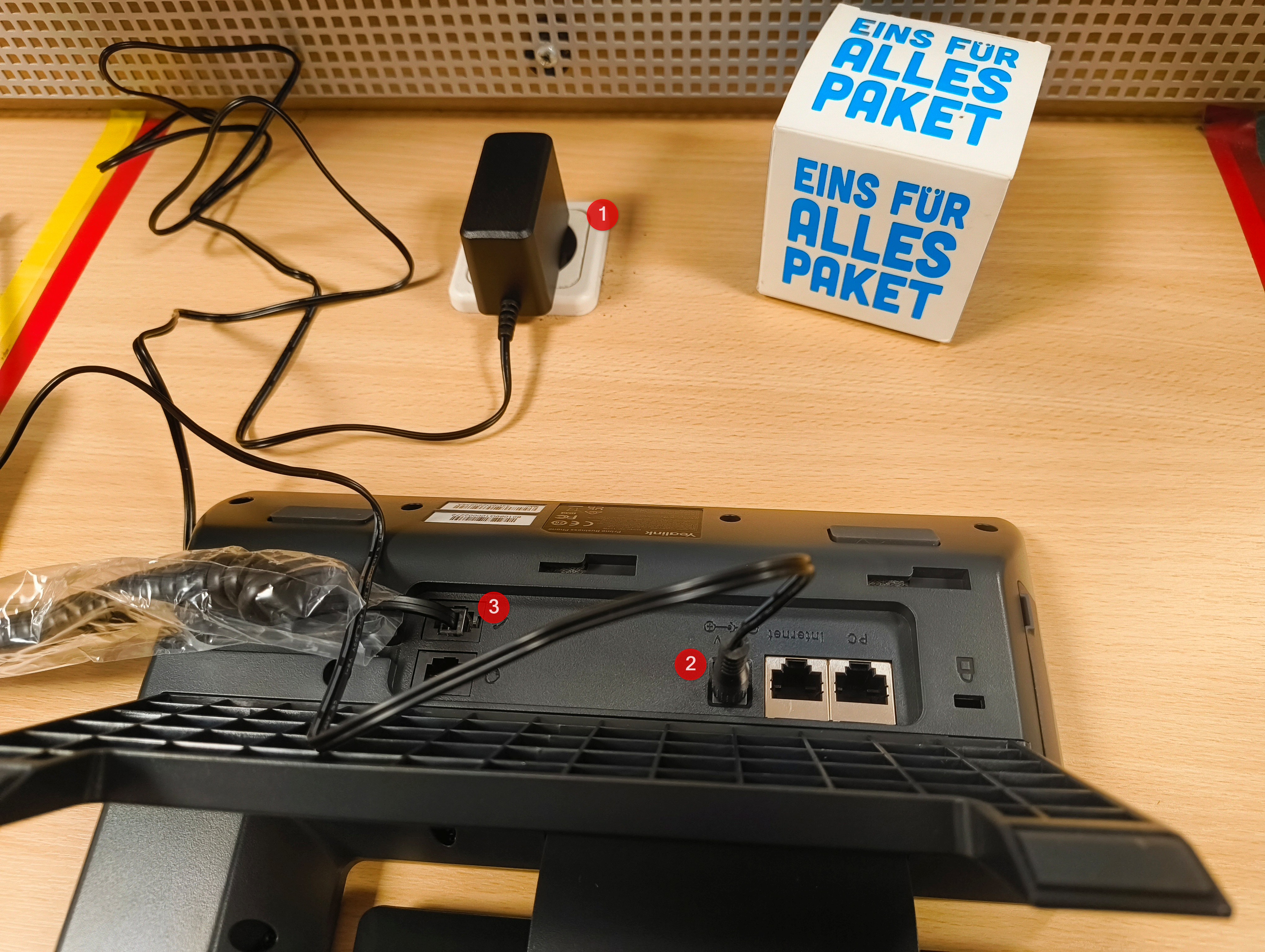 - Telefon mit Netzteil mit Strom versorgen und Hörer anschließen